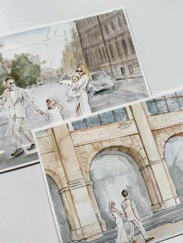 Ranka pieštas nedidelis paveikslėlis iš nuotraukos – tai subtili ir asmeniška dovana, įamžinanti Jums brangią akimirką. Dažniausiai kuriamas A5 formato (15 × 21 cm) kūrinys puikiai tinka bet kokiam interjerui, patogu įrėminti.