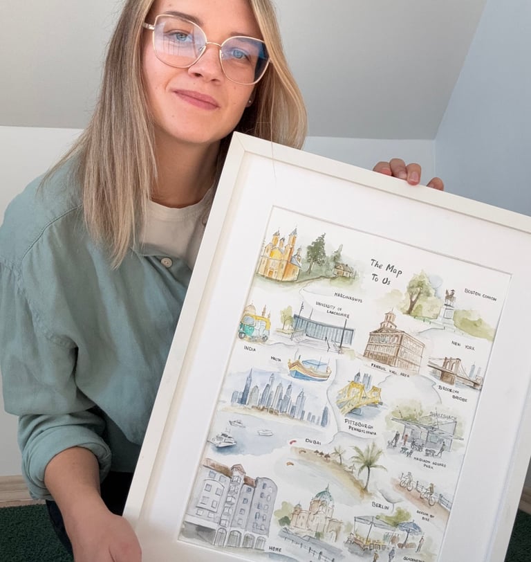 Tai ne tik dekoratyvus paveikslas, bet ir emocijų kupinas prisiminimų žemėlapis, pilnas simbolių, detalių ir asmeninių reikšmių. Žaismingas, šiltas ir unikalus kūrinys, kuris taps išskirtine vestuvių dovana ir ilgalaikiu namų akcentu, primenančiu bendros kelionės pradžią.